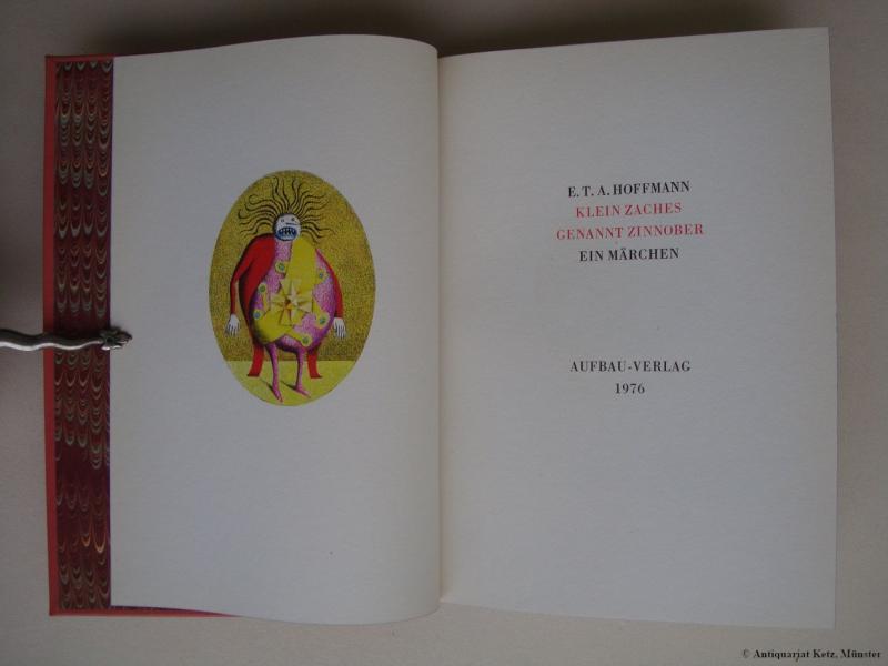 Hoffmann, E. T. A., und Hans Ticha: Klein Zaches genannt Zinnober. Ein Märchen. Illustriert von Hands Ticha. (Vorzugsausgabe in Ganzleder). 1. Auflage. Berlin, Aufbau-Verlag, 1976. Mit 38 farbigen Originalgraphiken, davon 18 ganzseitig. 156 Seiten, 2 Bl. (20 x 14,5 cm). Ziegelroter Originalkalblederband mit Deckelvignette und Rückenschild in Blau und Gold., blauer Schnitt, marmorierte Vorsätze.