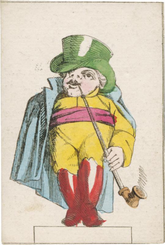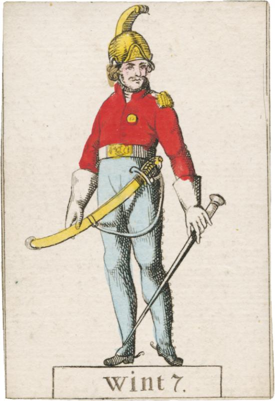 De Loterij van DON QUICHOT en SANCHE PANCE. 32 Bildkarten, komplett, und 57/60 Spruchkarten (30 schwarze, komplett, und 27/30 rote: 19, 20 und 22 fehlen). Kupferstich und Radierung, 70x46 mm, rechteckige Ecken. Rs.: Gitter mit Sternchen und punktierten Rauten in Rot (Bildkarten) bzw. Blau (Spruchkarten). Um 1821. Lit.: Cary coll. HOL 15; Buijnsters S. 132 und 174 (Farbabbildung). Die Bildkarten setzen sich aus 15 Gewinnen: vornehme Herren, Musiker (Laute, Mandoline (?), Querflöte), feine Soldaten, elegante Damen, und 15 Nieten: Modejecken, affektierte Frauen, sowie um 2 Karten mit besonderer Umrandung, „DON QUICHOT, D.L.MA.“ (De La Mancha) und „SANCHE PANCE“. Die Spruchkarten tragen den Titel von bekannten Melodien, oft in Französisch, zum Beispiel „Un ancien proverbe nour dit“, „Femmes voulez vous“, aber auch „God save the King“, „Der Fögelfänger“ (wohl Papageno in der Zauberflöte), „Zonder liefde“ (Ohne Liebe), „Malbourough“ (wohl „Malbrough s’en va-t-en guerre“ - „For He’s A Jolly Good Fellow“)... Die Verse geben aber nicht den Liedtext wieder, sondern beziehen sich auf das Spiel und den Gewinn. Hübsches Spiel.