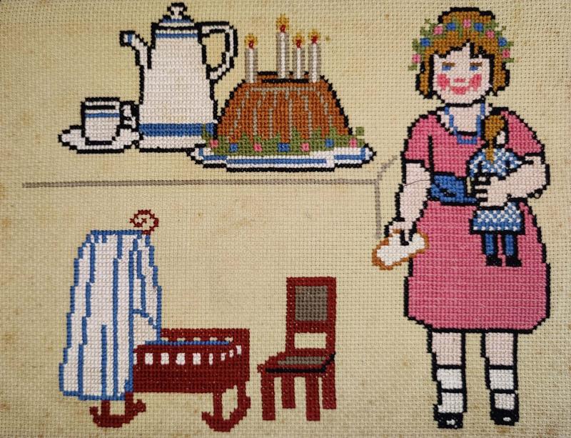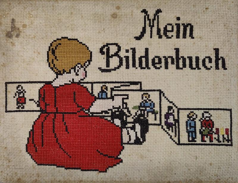 Unikales Stickmusterbuch als großformatiges Leporello-Bilderbuch mit zahlreichen farbigen Kinderszenen (Kindergeburtstag, Kinderspiele, Puppen und Tiere, Schule, Schaukelpferd, Schlittenfahrt usw.). Gering stockfleckig, sonst erstaunlich gut erhalten. - Sehr dekorativ.