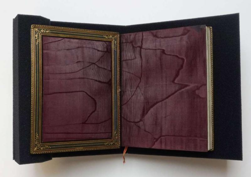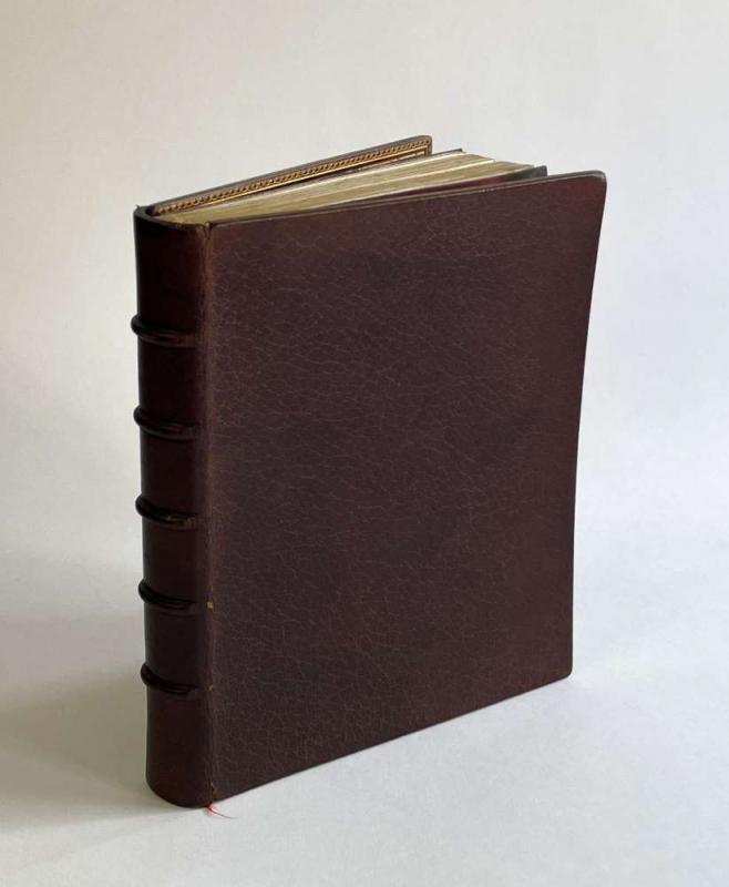 Lyon, A. Roux, 1886 ("achevé ... le VIII Sept. l'an de N.S. 1887"). Kl.-8°. 1 w. Bl., 25 beidseitig gewebte Bll., 1 w. Bl. Mit 3 ganzseit. Ill., Frontispiz mit leergelassenem Wappen, zahlreichen Initialen u. durchgehenden floralen bzw. figürlichen Bordüren nach mittelalterlichen illuminierten Stundenbüchern. Text und Illustrationen vollständig mit Jacquard-Technik in Schwarz auf silbergrauer Seide gewebt. Wertvoller, dunkelbrauner Maroquin-Meistereinband d. Zt. auf 5 Bünden, mit doppelten Goldfileten auf den Kanten, Kopf- u. Fußgoldschnitt, Dublüre in burgunderroten Moiré-Seidenvorsätzen mit floralen Goldbordüren, - Prägungen à la Dentelle und -Filetierung der Innendeckel. Signiert J. Kauffmann (vorderer Innendeckel) u. Ch. Meunier (Rückdeckel). Einband an wenigen, kleinen Stellen sehr leicht berieben. Frontdeckel leicht konkav gewölbt. Durchgehende Feuchtigkeitsspuren vor allem am Fußssteg, zu Beginn und am Schluss etwas ausgedehnter, auf den ersten Seiten auch an der oberen Außenecke. Alle Seiten mit sauberen Kantenabschlüssen und ohne Ausfransungen. Insgesamt ein schönes Exemplar.