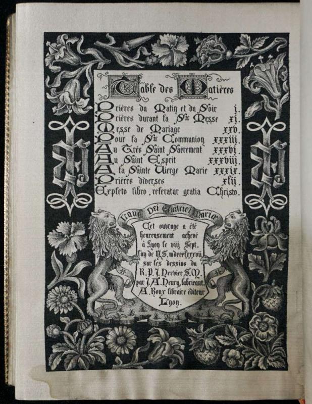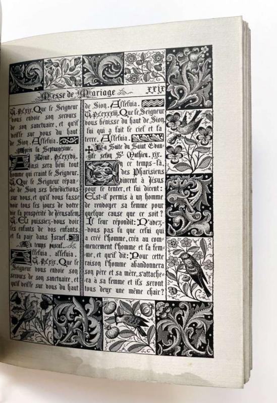 Von größter Seltenheit, nur in einer kleinen Auflage von ca. 50 fehlerfrei gewebten Exemplaren vorhanden. - Vicaire V, 342. - P. Marais, "Note sur un livre de prières en tissue de soie", in: Bulletin du Bibliophile, 1889, S. 163-166. - A. Laillier, „Une merveille artistique: notice sur un livre de prières tissé en soie", in: Bulletin de la Société industrielle de Rouen, 1er janvier 1890, S. 267-270. - Höhepunkt der Produktion mit einer Jacquardmaschine. Nach dem Vorbild mittelalterlicher Stundenbücher hergestelltes Werk und der einzige gelungene Versuch, ein Buch mit lesbarem Text vollständig zu weben. - Dieses technische Wunderwerk wurde in Lyon hergestellt, der Hauptstadt der Seide und Heimat von Joseph Marie Jacquard (1752-1834), dem Erfinder des ersten programmierbaren Webstuhls. Die Jacquardmaschine, die als wichtiger Meilenstein in der Geschichte der Informatik und als Inspiration für die „Analytical Engine" von Charles Babbage gilt, wird durch austauschbare Lochkarten gesteuert, die zu einer fortlaufenden Sequenz zusammengefügt werden (siehe James Essinger, Jacquards Web: How a Hand-loom led to the Birth of the Information Age, 2004). Das Buch wurde von der Firma J. A. Henry auf einem solchen programmierbaren, automatischen Jacquard-Webstuhl vollständig in silbergrauer und schwarzer Seide gewebt. Es wird geschätzt, dass 106.000 bis 500.000 Lochkarten erforderlich waren, um 400 Schussfäden pro 2,5 Zentimeter zu weben. Der Stoff mit dem Text, den Illustrationen und dem Buchschmuck ist so fein, dass die Programmierung und das Weben zwei Jahre und etwa fünfzig Fehlversuche in Anspruch nahmen: schließlich konnten schätzungsweise nur zwischen 50 und 60 fehlerfreie und lesbare Exemplare hergestellt werden. Nach dem Weben wurden die Seidenblätter gefaltet und auf Pappstücke montiert, um den Seiten die nötige Festigkeit zu verleihen. Jedes Exemplar des Buches wurde beim Verkauf individuell gebunden, viele Exemplare blieben jedoch jahrelang auf Lager. - Lillian Randall stellte fest, dass die "Illuminationen" dieses besonderen Gebetbuchs aus einer Monografie aus dem späten 19. Jahrhundert stammten, die „Imitation de Jésus-Christ" (Paris: Gruel et Engelmann), die Reproduktionen verschiedener illuminierten Handschriften aus dem 14. Bis 16. Jhd. enthält. Die Illuminationen wurden von R. P. J. Hervier ausgewählt, der auch für die gesamte Gestaltung des Bandes verantwortlich war. Ein Exemplar des Buches wurde 1889 im Pavillon von Lyon auf der Weltausstellung ausgestellt, wo sein Hersteller, J. A. Henry, den Grand Prix gewann. - Dieses gewebte Buch steht natürlich in der Tradition des persönlichen Andachtsbuchs: das kleine Format, die Ikonografie und die allgemeine Ästhetik mit Ranken, Fileten, Miniaturen, Initialen. So wie ein mittelalterliches Manuskript häufig auf den Auftraggeber zugeschnitten wurde, indem sein Wappen in eine Komposition eingefügt oder ein Heiliger, dem er besonders zugetan war, so weist dieses Stundenbuch ein Wappenschild im Frontispiz auf, dessen Feld leer bleibt, um eventuell das Wappen, den Namen und das Motto des Empfängers einsticken zu können. Bei unserem Exemplar wurde das Feld leer gelassen.